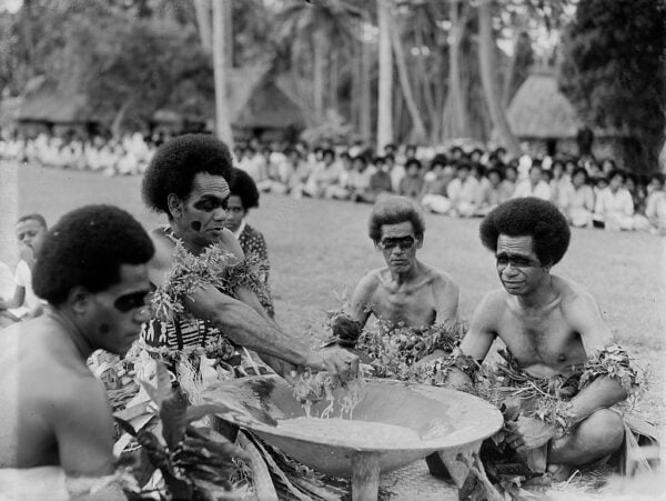 カヴァという飲み物は不思議な飲み物で、そもそもカヴァ(kava)という言葉(トンガ語)自体が「苦しい」という意味で、胡椒の仲間の背の低い木の根を砕いて作られる、成分的に日本では販売できない飲み物です。アルコール飲料ではないのですが、文化的な立ち位置は似たようなもので、酩酊をもたらす飲み物として、または百薬の長として、さらには儀式に欠かせないツールとして、生活の様々な場面で愛飲されて続けています。
