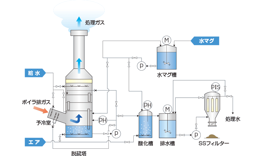 こうして、かつて日本の経済発展に大きく寄与した貴重な天然資源である硫黄は、環境保護のために回収し処理しなければならない、始末に困る厄介な有害物質に成り下がってしまいました。現在の日本では、電力、鉄鋼、紙パルプ、化学など、煙を出したり排気が伴う工場には硫黄の排脱が義務付けられていて、様々な工場の様々な場所で無数の排煙脱硫装置が稼働しています。