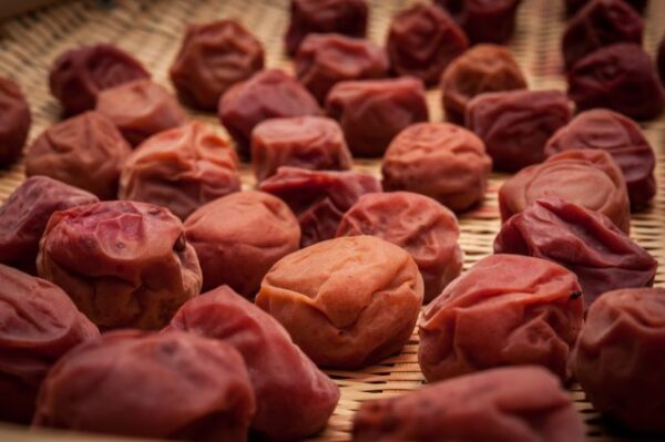 現在のように食用に梅干しが消費されるようになるのは江戸時代になってからのことです。それまでは庶民には薬として重宝されていた梅干しですが、戦国の武士たちにとっては塩分、栄養価、保存性、携帯性などにおいて、行軍や戦場でのレーション(野戦糧食)として梅干しは大変に重宝されていました。その武士たちが集う江戸では梅干しの需要が高く、これに目をつけたのが、領地が痩せた山地ばかりで平地が海べりのわずかほどしかない紀伊田辺藩という紀州藩の貧乏支藩で、「コメは無理でも梅なら育つ!」と領民に年貢の軽減と引き換えに梅の栽培を奨励しました。タイミングとしては堺を起点として上方と江戸を結ぶ物流の大動脈、菱垣廻船が始まっていて、領内にある、奈良時代には「室の江」と呼ばれた良港、田辺港にも寄港していました。梅を栽培して梅干しに加工し、菱垣廻船で運び、江戸で売り捌けば必ず売れる。と目論んだわけです。当時の梅は実は小さく種ばかりで果肉も薄い、現代の梅とはかけ離れた藪梅だったために、財政政策として梅干しを採用する藩はなく、紀州田辺産の梅干しは江戸の市場を独占し、目論見は大成功しました。武士の食料需要と藪梅の大量供給によって、やがて梅干しを日常的に食べる文化が全国の庶民に広まりました。