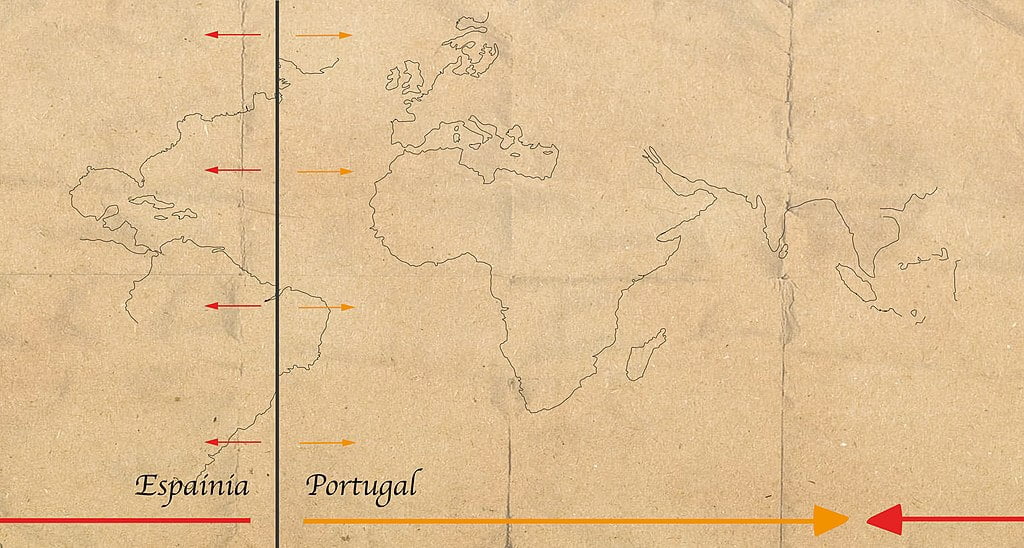 異世界の亜人どもはなぜか豊かで、なぜか友好的な連中もいて、交易ルートはすぐに軌道に乗り始めました。するとスペインは「あれ?俺このまま異世界で無双できるんじゃね?」と思い始め、先に飛び石航法で世界中の海岸に拠点を築きまくって儲けまくっていたポルトガルと一緒になって、二国は荒唐無稽な条約を結びます。「現在のブラジル東部あたりで世界を切り分けて、東はポルトガル、西はスペインの土地ってことにします!」と宣言しました(後のトルデシリャス条約)。この二国による世界支配という、中学生の自意識のような、身勝手極まりない妄言は、そこに史上最低のローマ教皇と名高いスペイン出身のアレクサンデル6世が裏書きをして権威が付いたことによって、キリスト教世界の中の公文書的なものになってしまいました。