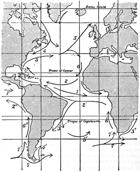 一方でポルトガルに出遅れたスペインは、仕方なく、アフリカ西岸から西に流れる海流に乗って大海原を進むことにしました。それに乗って危険度マックスの大西洋を横断すると、幸いなことにいくつかの島々やその先に広い感じの陸地も見つかりました。原始人か亜人のような連中もいました、銃どころか鉄も文字も持っていない得体のしれない連中でしたが、銃と砲で開拓者たちは各地を簡単に占拠することができました。拠点を築きながら先へ進むと、やがて海流は北に流れ始め、それに乗ると今度は現在のキューバあたりで海流は東に向きを変え、そのまま自国に流れ着くことができました。意外なほどあっさりと大西洋に交易ルートができました。
