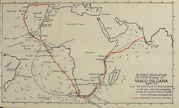 コンスタンティノープル陥落事件で膝から崩れ落ちるほどのショックを受けたスペインとポルトガルは、新たな交易路と未知のキリスト教世界を求めて、キャラベル船に、敵であるムスリムの商人たちが使う三角帆や羅針盤などのテクノロジーをインストールして、大西洋を狂ったように東奔西走しはじめました。とりあえず「明日は我が身」なわけで、ムスリムに征服される恐怖が彼らを「まだ見ぬ海の向こうにあるかもしれない異世界」へ向かわせました。下手な鉄砲数撃ちゃ当たる戦法でしたが、とりあえず大西洋沖に出ると南向きの海流があるので、それに乗ってアフリカ西岸まで南下し、そのままアフリカの沿岸沿いを廻って喜望峰を通過してインドにまで到達する交易ルートを確立しました。このルートは国土が大西洋に面しているポルトガルが速攻で押さえました。押さえると言っても銃と砲も使って土地を占拠して拠点化する荒っぽいやり方です。拠点ができると補給と整備ができるので、航海距離をどんどん延長できるので、長大な交易ルートができました。